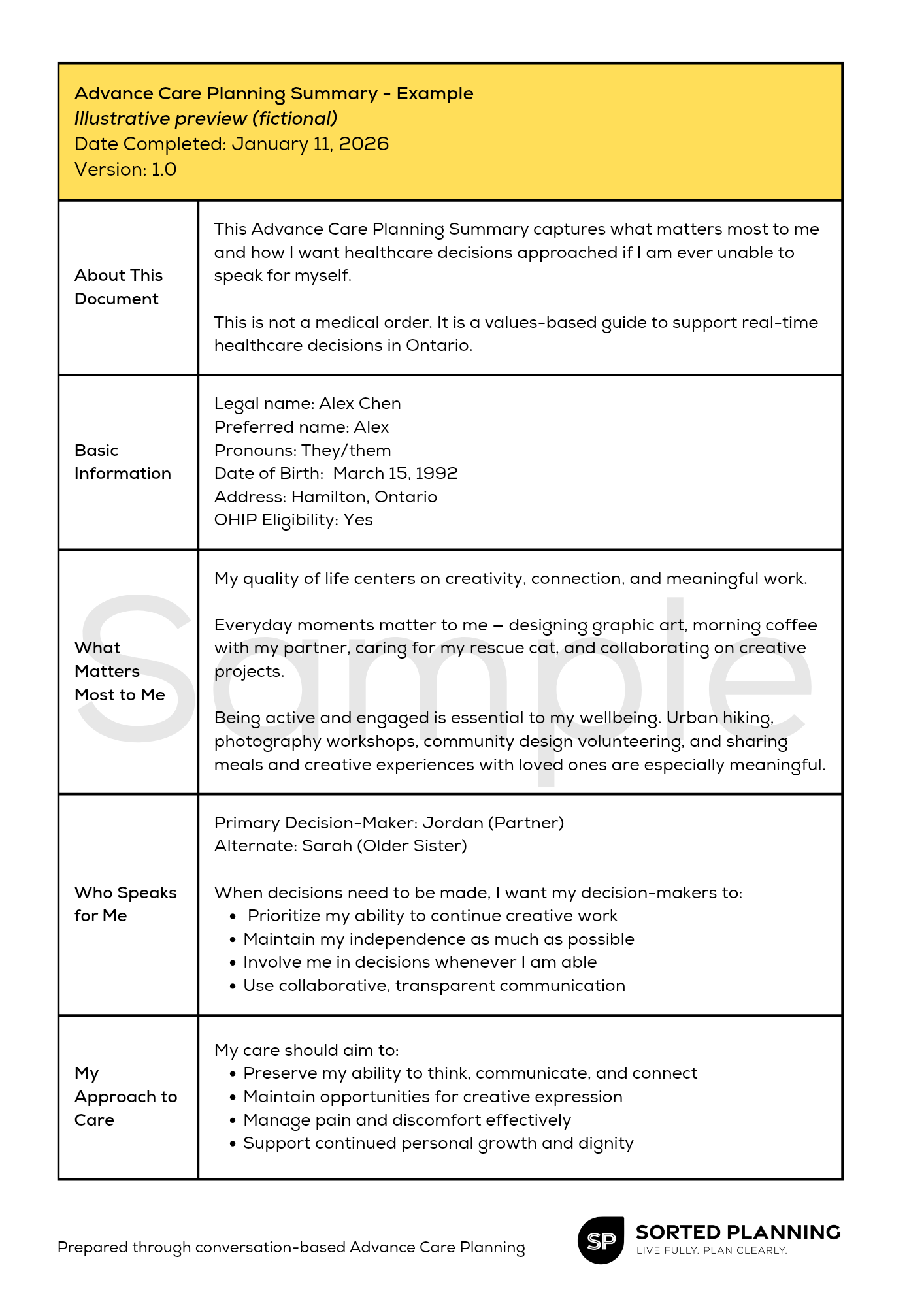 Your Personalized ACP Summary Document (see example below). A clear, compassionate guide that captures your values, priorities, and wishes —written in your voice, ready to share. This becomes the reference point for anyone making health and personal care decisions on your behalf.